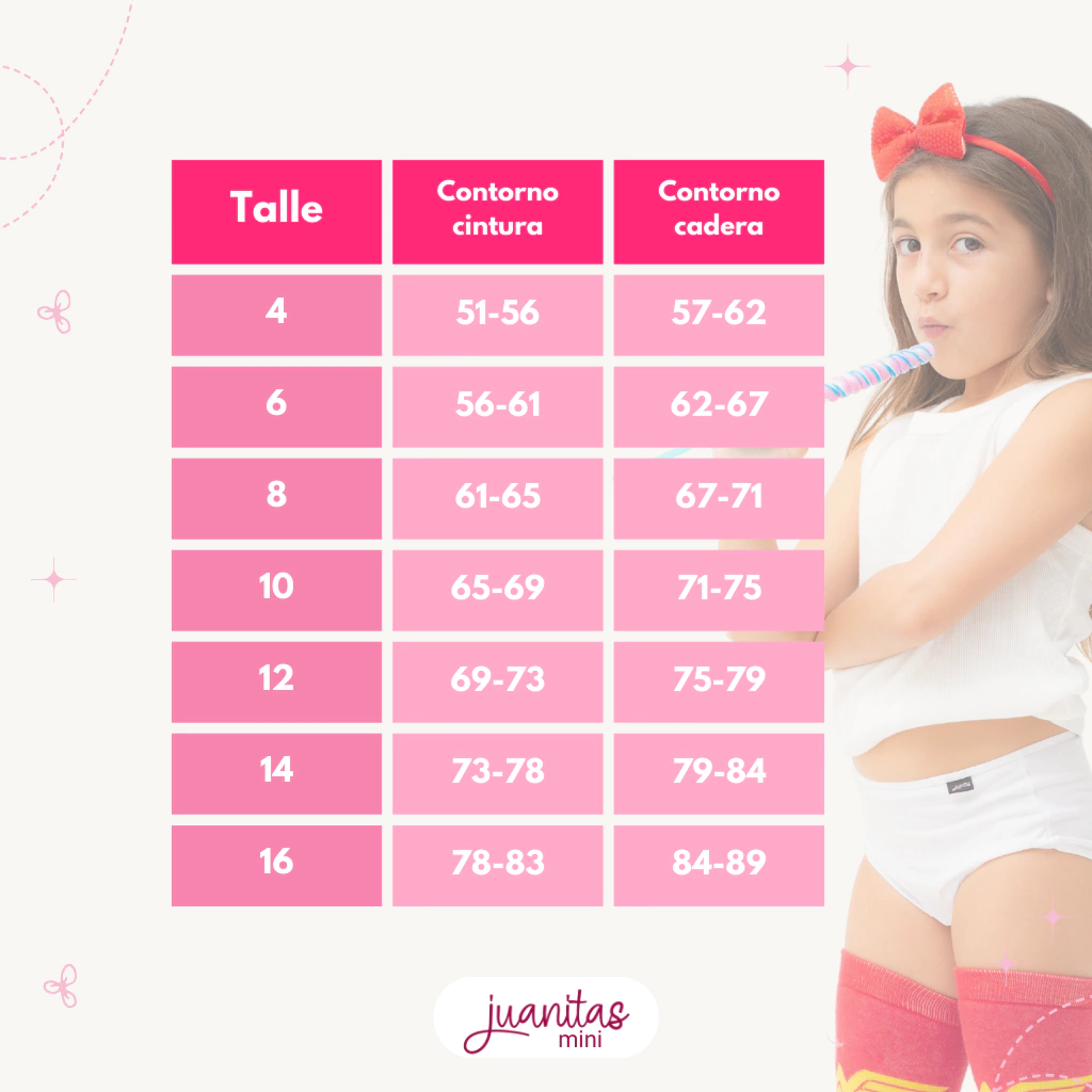 El pack incluye 4 bombachas estampadas surtidas y 4 bombachas en color liso (sujeto a stock)
